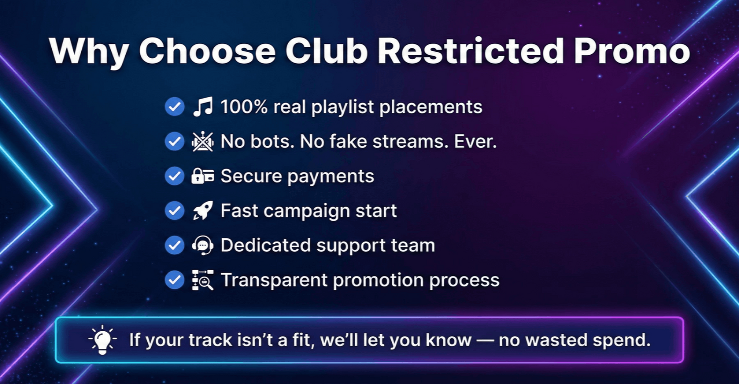 Artists choose Club Restricted Promo for honest, results-driven promotion. We deliver 100% real playlist placements with no bots or fake streams, ensuring your music reaches genuine listeners. With secure payments, a fast campaign start, and dedicated support, you’re always taken care of. Our transparent process means no surprises - and if your track isn’t a fit, we’ll let you know upfront so there’s no wasted spend.